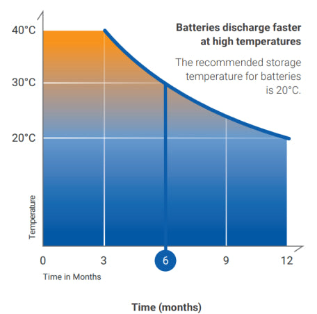 La temperatura e l’umidità sono i fattori che influiscono maggiormente sull’autoscarica di una batteria, e quindi sulla durata a scaffale di una batteria: